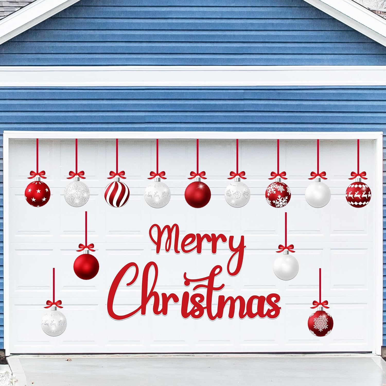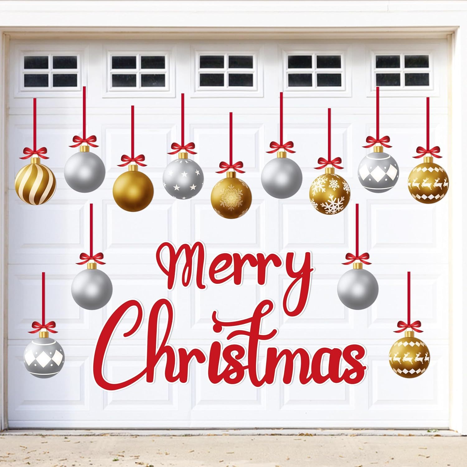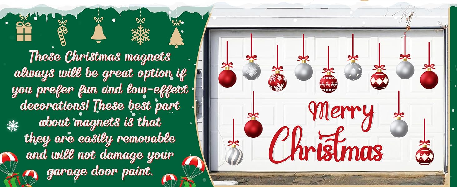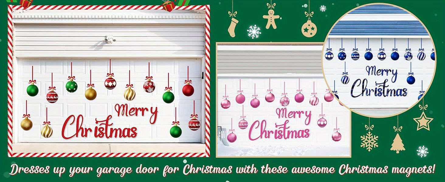 Transform your garage door with 13 Christmas ball magnets, 6 letter magnets spelling 'Merry Christmas', and 13 bow rope magnets, totaling 32 magnets! These large magnets will cover your garage door visibly. They have a strong magnetic hold, are adorned with festive prints, and have a magnetic back for easy removal without damaging the surface. They can be directly attached to any metal or magnetic surface, are adjustable and removable without leaving any residue. Spread holiday cheer to your neighbors with these festive magnets, perfect for decorating your garage door, refrigerator, metal front door, dry erase board, cabinets, and more. Enhance the holiday spirit by dressing up your garage door with these adorable magnets this winter!