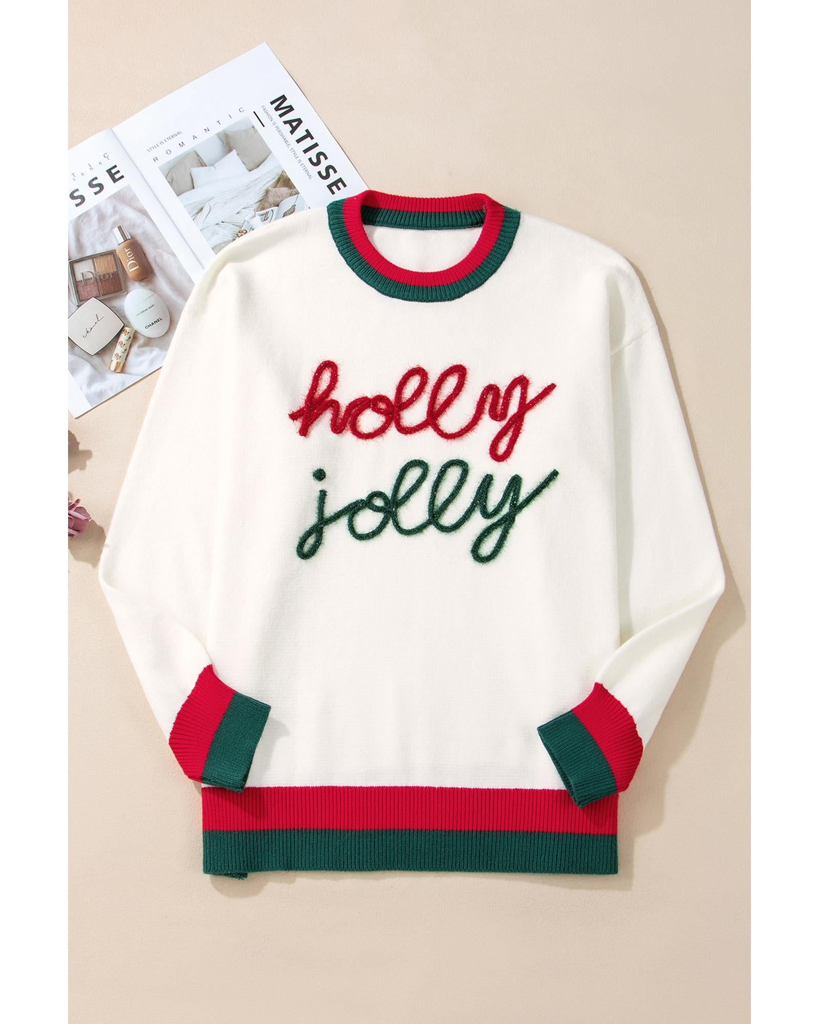 - White Tinsel Holly Jolly Pattern Colorblock Edge Drop Shoulder Plus Size Sweater