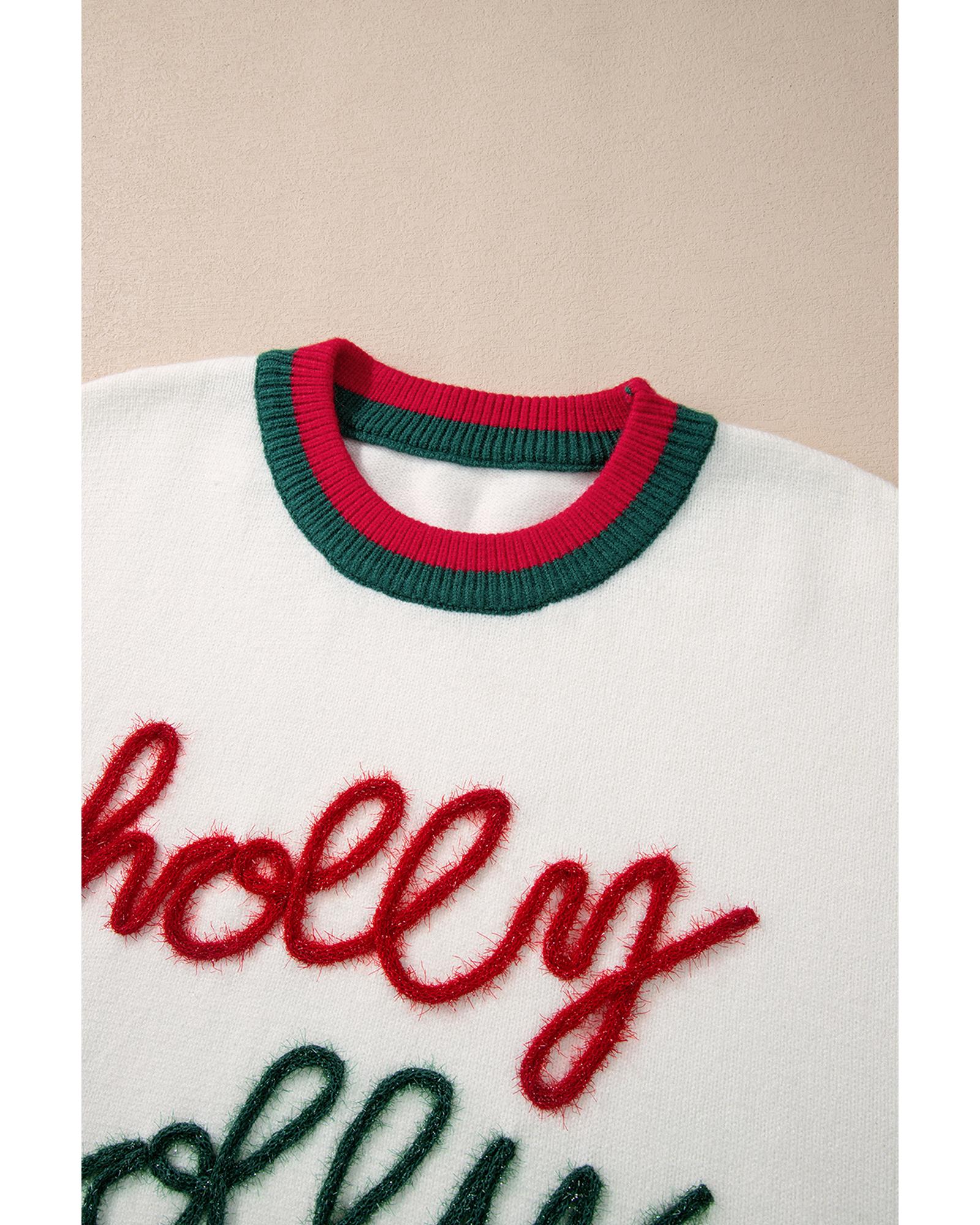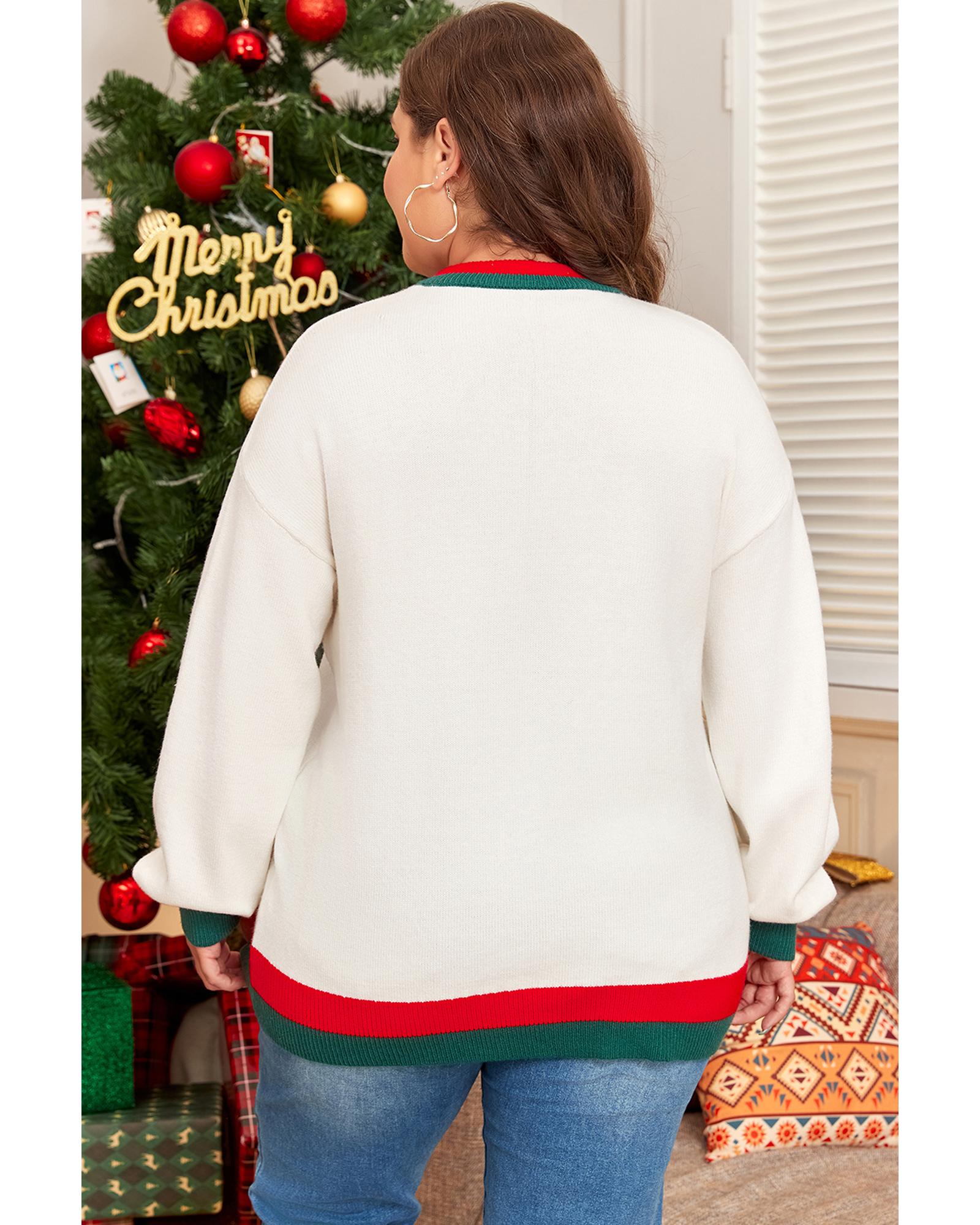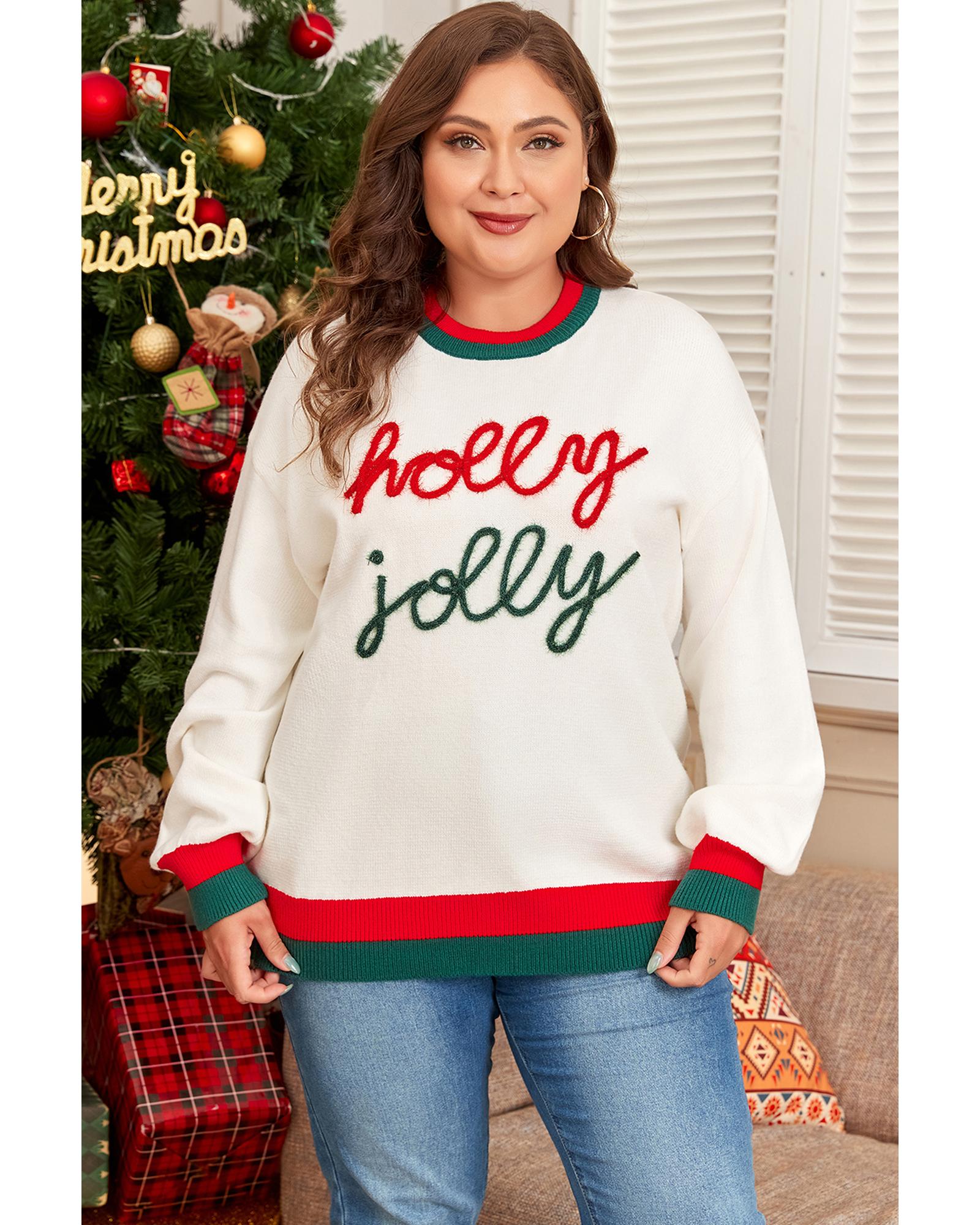 - White Tinsel Holly Jolly Pattern Colorblock Edge Drop Shoulder Plus Size Sweater